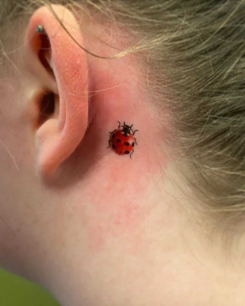 This behind-ear tattoo displays a lifelike red ladybug with tiny black spots and detailed legs.