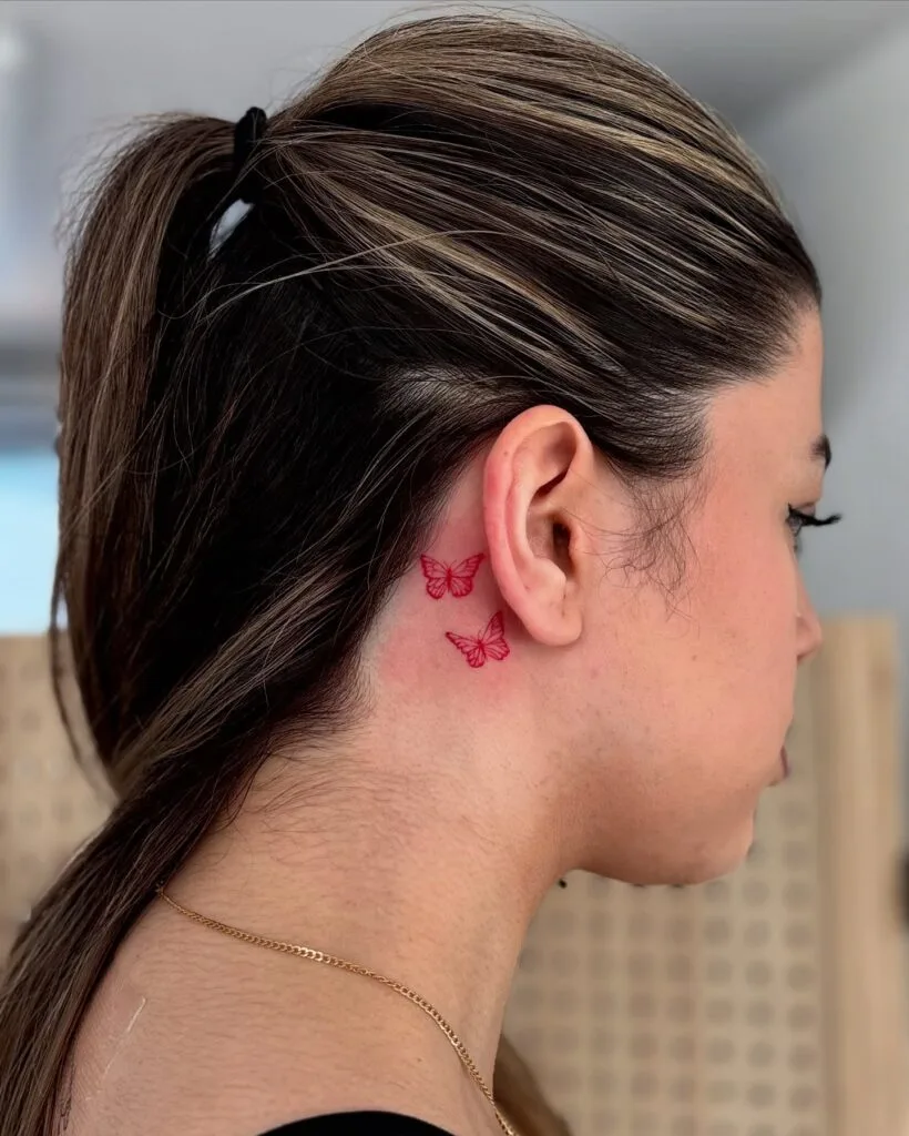 This behind-ear tattoo showcases two delicate red butterflies, their fine outlines creating a soft, graceful effect.