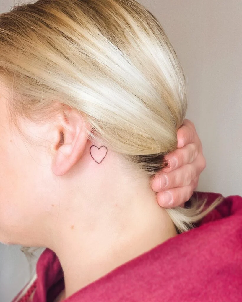 This behind-ear tattoo features a clean black heart outline, perfectly placed for a subtle yet meaningful touch.