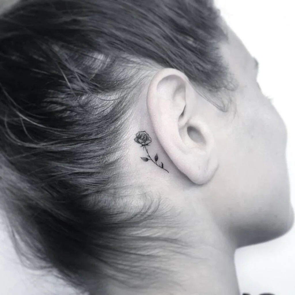This behind-ear tattoo shows a finely outlined rose with clean black lines and subtle leaf details.