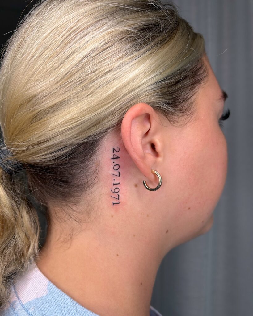 This behind-ear tattoo shows a meaningful date, 24.07.1971, arranged vertically in bold black numbers.