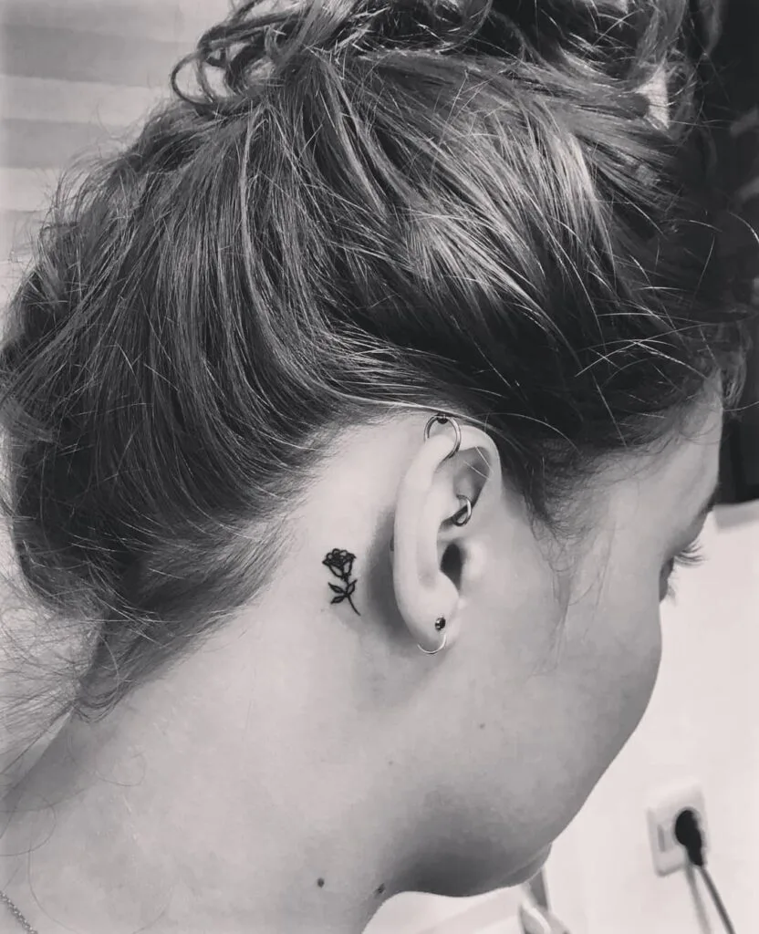 This behind-ear tattoo features a delicate black rose drawn with clean lines and soft details.