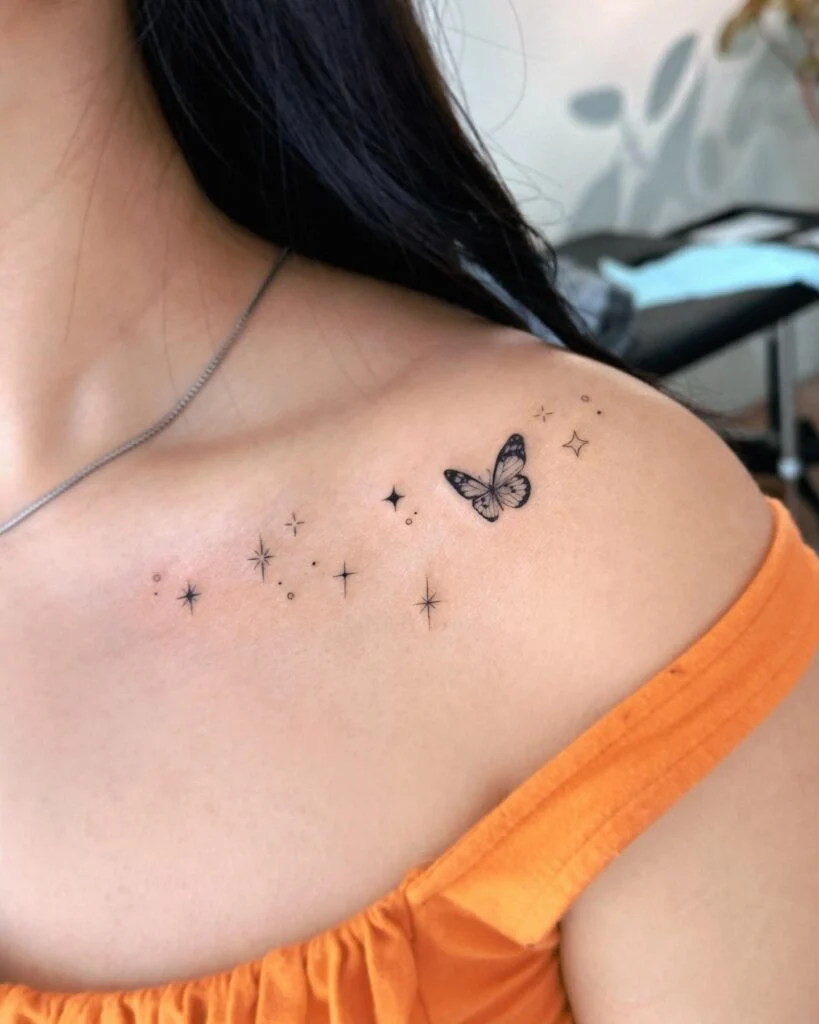 Fine feathers, dotted constellations, or short quotes curve beautifully along this graceful line. Off-shoulder tops or open necklines let the artwork shine, while higher collars can keep it hidden.