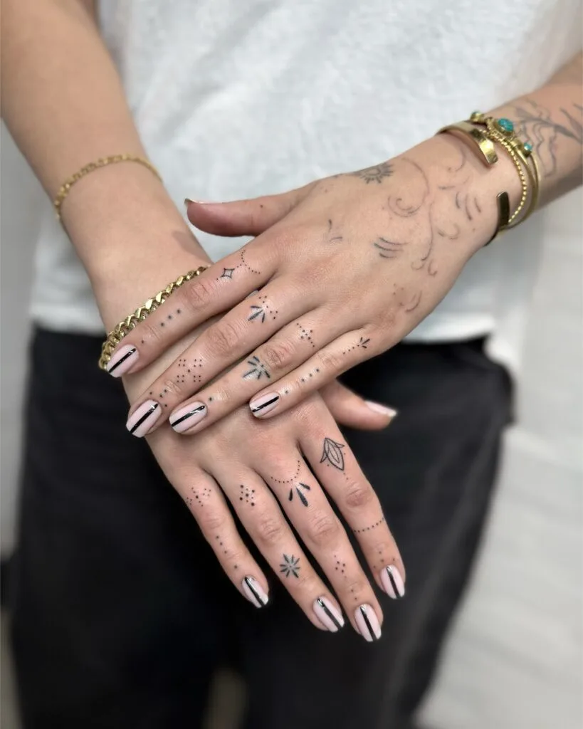 Fingers bring a trendy, intimate feel to small tattoos that stand out in everyday gestures and photos.