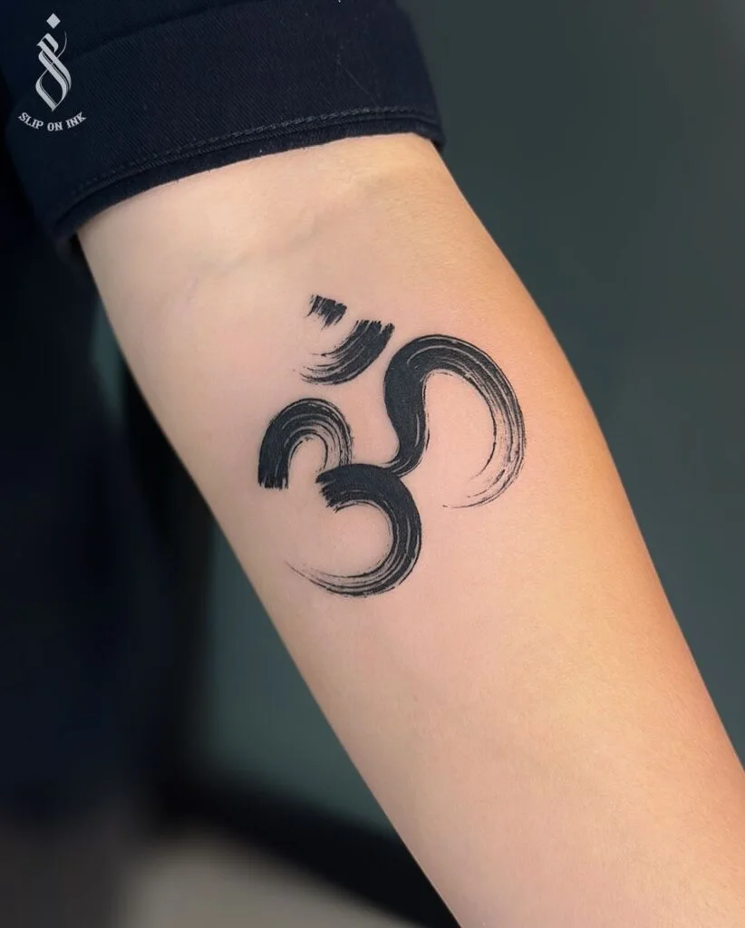 This striking tattoo features the sacred Om symbol created with bold brushstroke-style lines. The sweeping curves and textured ink strokes give it a dynamic and artistic appearance while preserving its spiritual essence. Om represents the sound of the universe and the interconnectedness of all life.