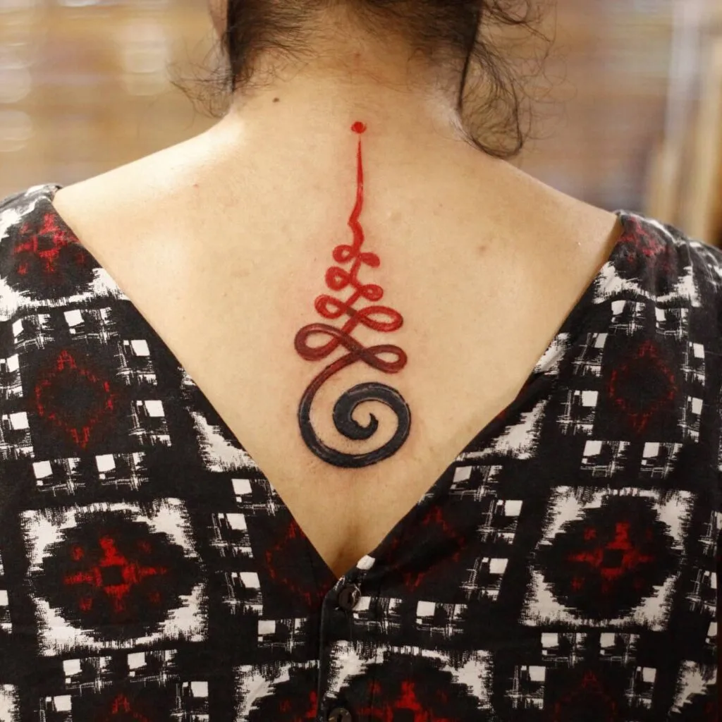 This striking Unalome tattoo uses bold red and black ink to emphasize the soul’s transformative journey. The black spiral at the base represents the beginning of life, confusion, and struggle. As the path winds upward in vivid red, it symbolizes growth, resilience, and spiritual evolution.
