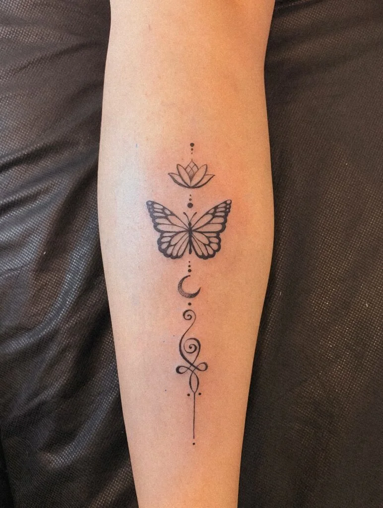 This elegant tattoo weaves together powerful symbols of transformation, renewal, and balance. A delicate butterfly takes center stage, representing growth and change, while a blooming lotus above it speaks of spiritual awakening and inner purity.