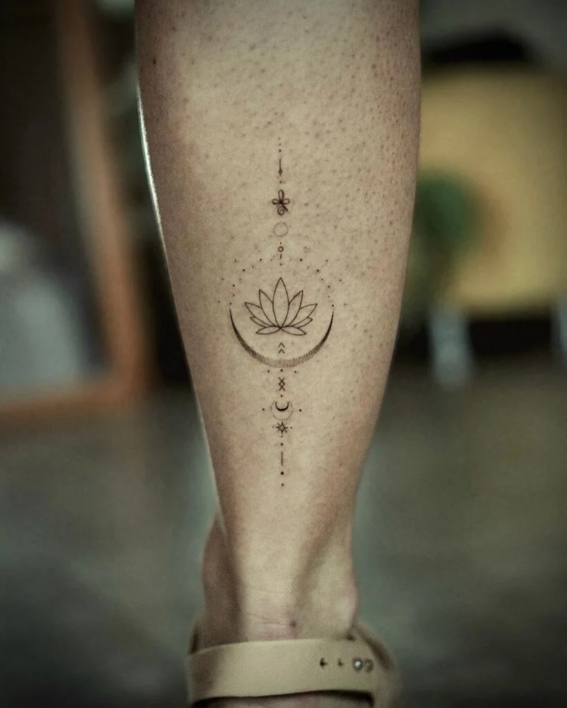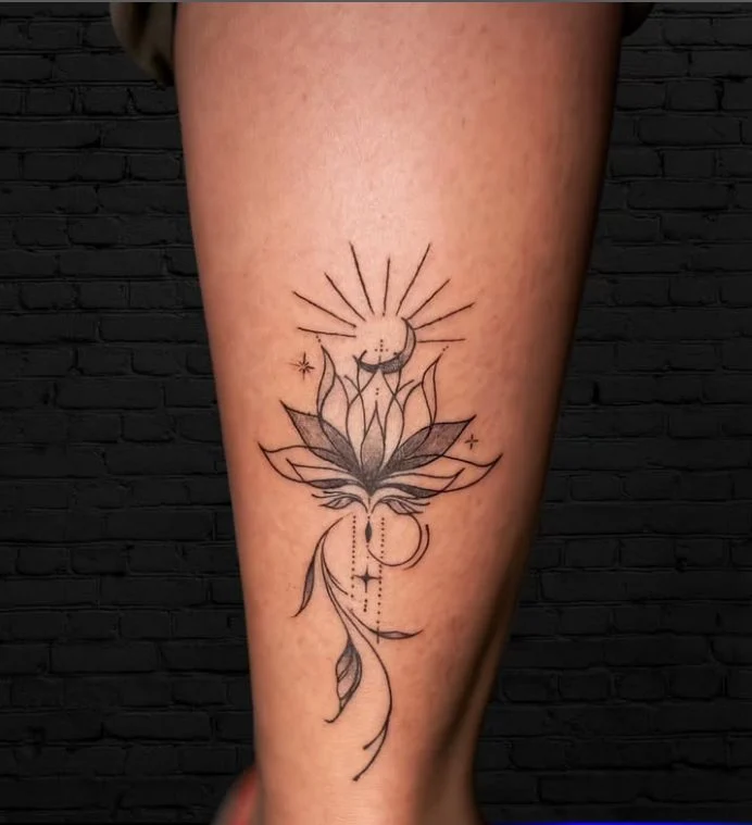 Delicate dotted lines and flowing elements extend downward, symbolizing spiritual grounding and life’s fluid journey. The curved lines resemble a feminine silhouette or divine energy, reinforcing the theme of inner balance and awakening. This leg piece blends celestial symbolism with the serenity of the lotus, making it a powerful tattoo of growth, light, and soulful transformation.