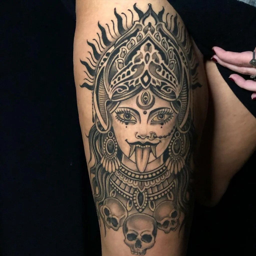 This powerful tattoo features the Hindu goddess Kali in a bold and commanding form. Her eyes radiate intensity, and her tongue extends as a symbol of raw, untamed energy. Adorned with intricate jewelry and an ornate headdress, Kali is framed by a radiant halo.