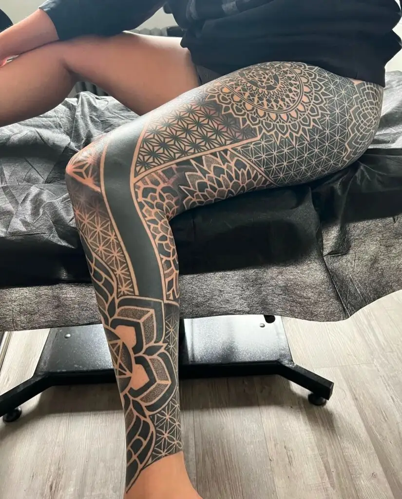 This stunning full-leg tattoo showcases a powerful blend of sacred geometry and mandala art. Bold blackwork areas frame intricate patterns like the Flower of Life and layered mandalas, creating contrast and depth across the thigh, knee, and shin.