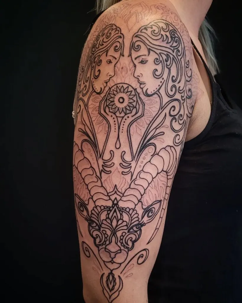 This intricate upper arm tattoo blends zodiac symbolism into a captivating design. At the top, mirrored feminine faces represent Gemini, each gazing at a detailed mandala-style flower between them, symbolizing balance and duality.