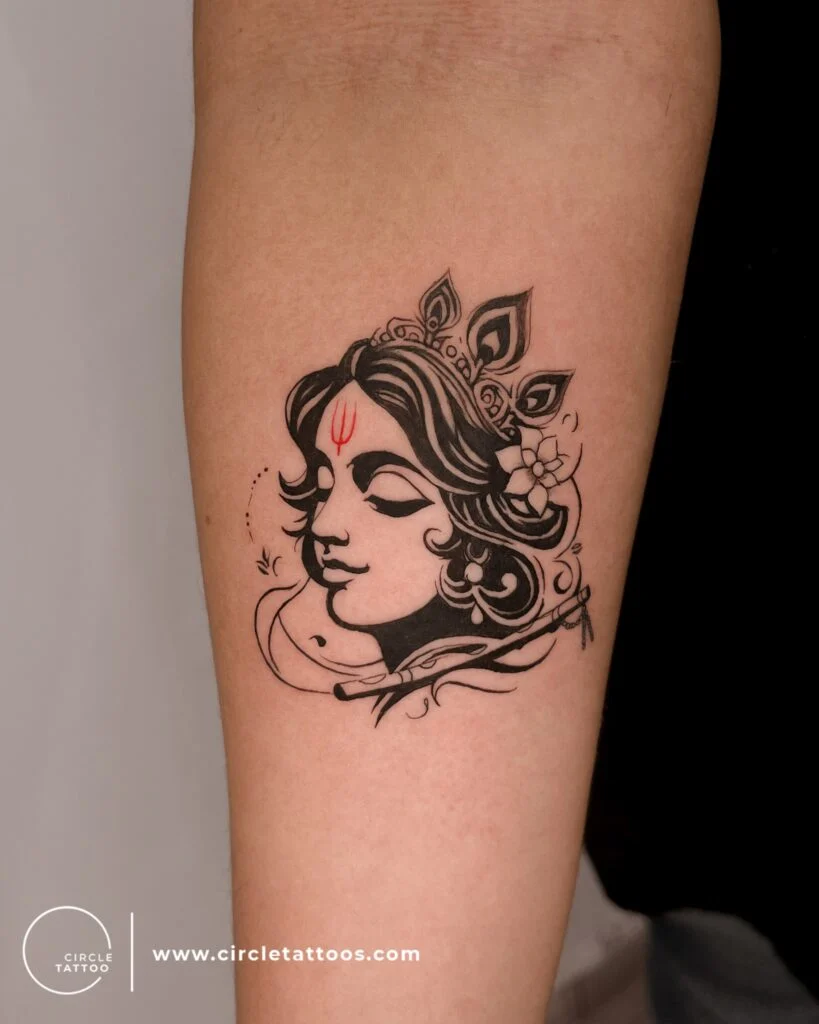This serene tattoo captures the calm, graceful face of a Hindu goddess, adorned with floral elements and flowing hair. The red trishul (trident) mark on her forehead symbolizes divine protection, strength, and spiritual awakening.