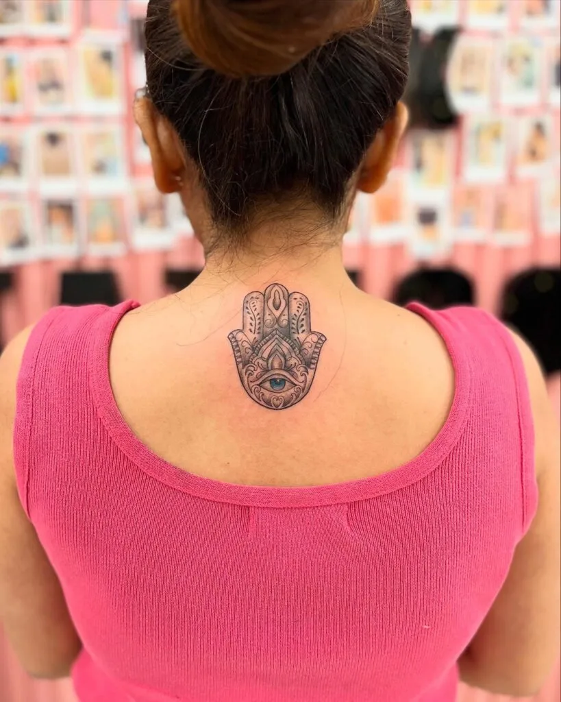 This striking upper back tattoo features the Hamsa hand, a revered symbol of protection, strength, and spiritual awareness. Intricately designed with ornamental details, the centerpiece is the all-seeing eye—believed to ward off negativity and bring clarity and intuition.