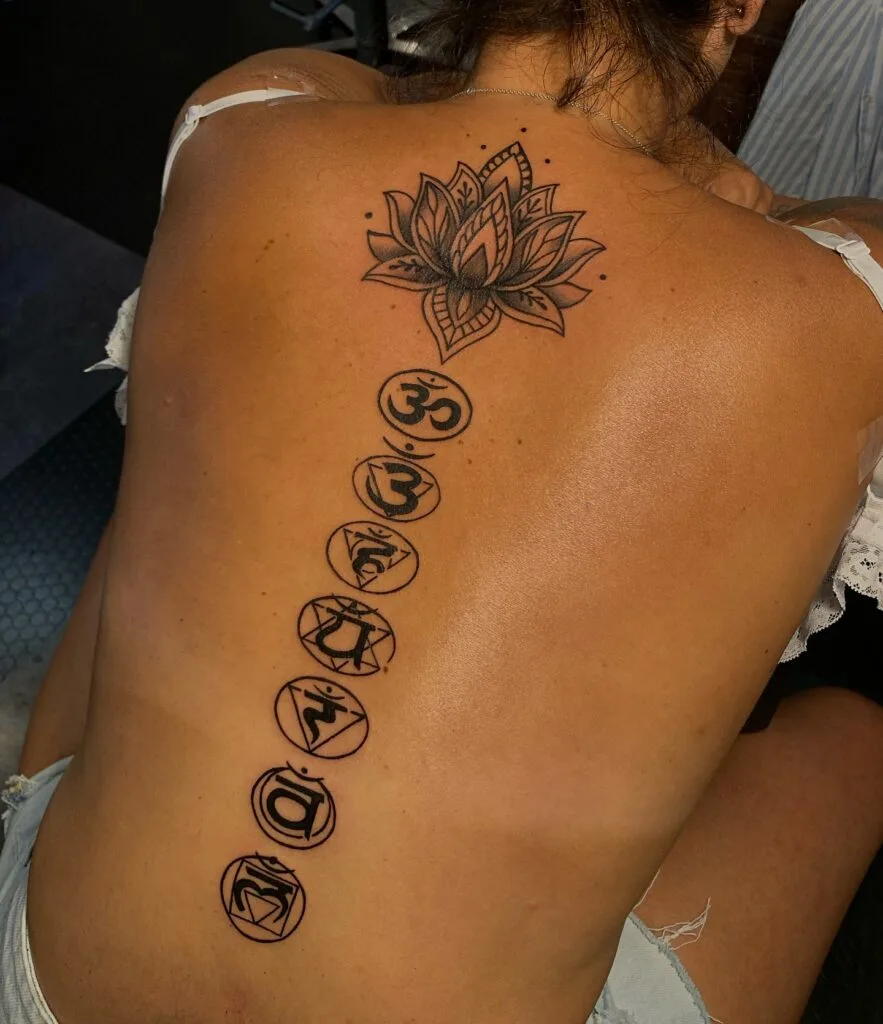 This elegant spine tattoo beautifully aligns the seven chakra symbols down the center of the back, topped with a blooming lotus flower. Each chakra—root to crown—is represented by its Sanskrit symbol, symbolizing the flow of energy through the body’s main energy centers.