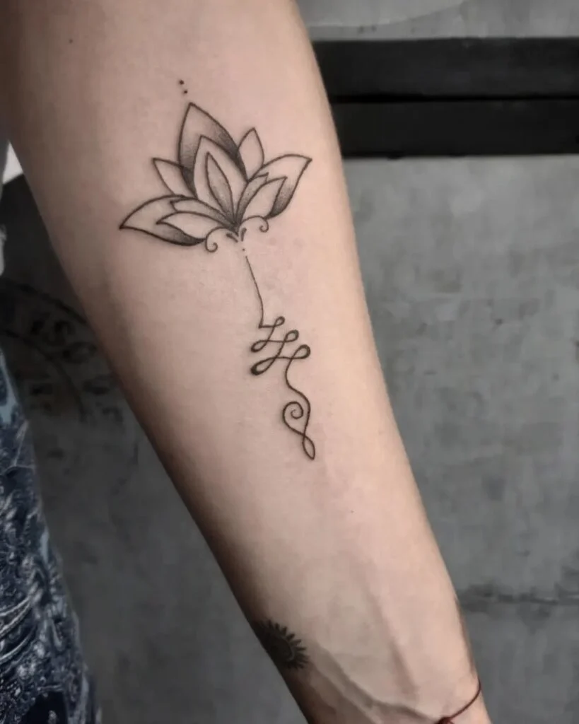 This delicate forearm tattoo blends the elegance of a softly shaded lotus flower with the flowing lines of a Unalome symbol. The lotus, symbolizing purity and spiritual awakening, sits gracefully above a downward path of loops and curls, representing life’s journey toward enlightenment.