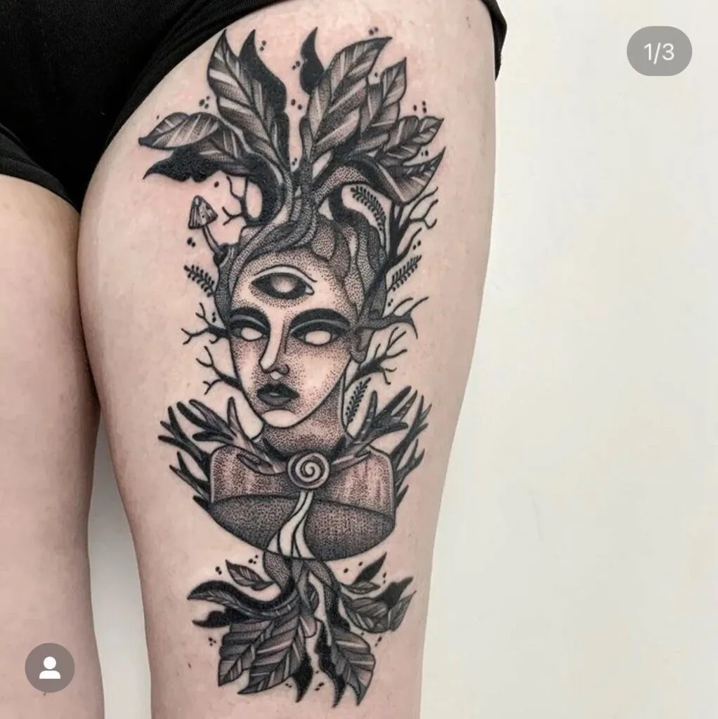 This bold thigh tattoo portrays a surreal tree spirit, blending elements of nature and mysticism. The central figure features a third eye, symbolizing heightened awareness and inner vision, while her crown of leaves and branches roots her firmly in the natural world.