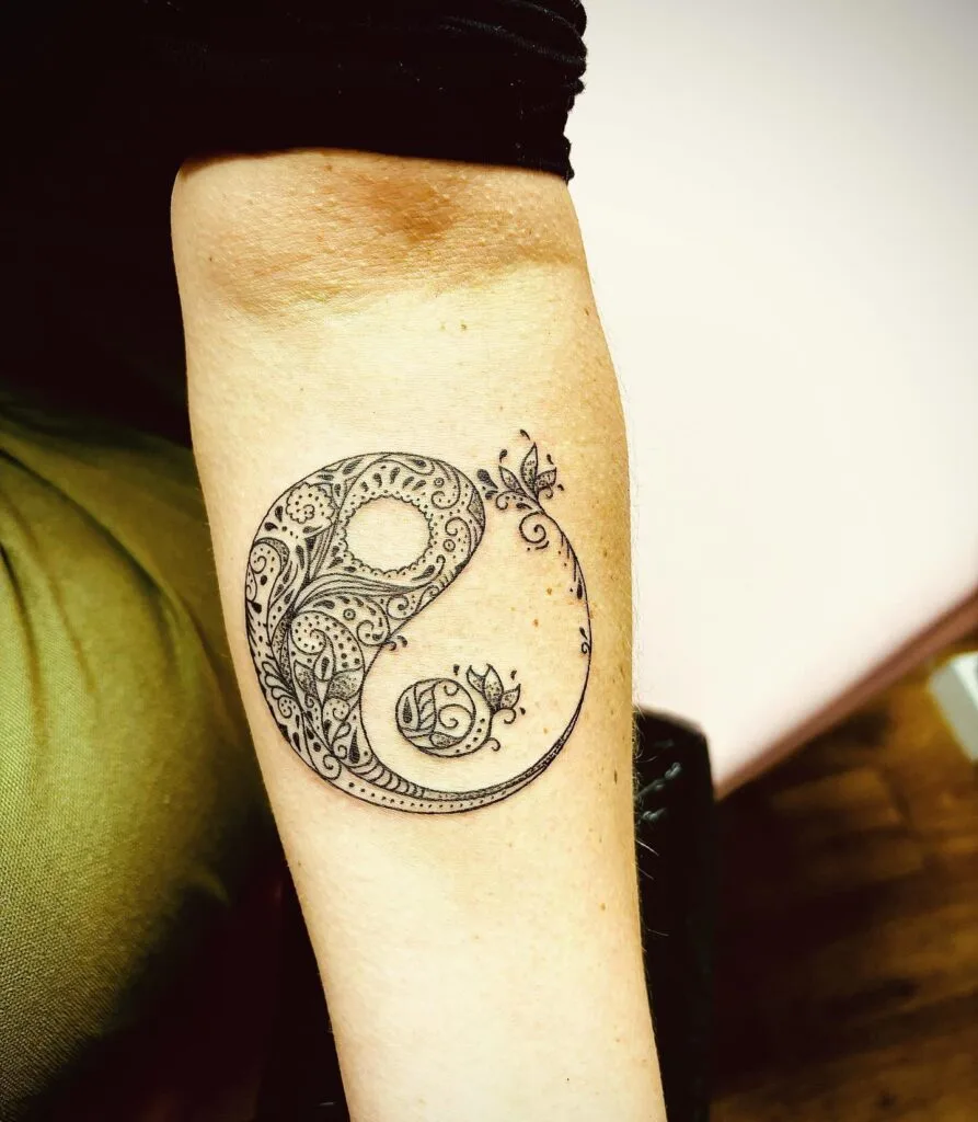 This stunning tattoo transforms the classic yin yang symbol into a graceful work of art with delicate ornamental details. One half of the symbol is filled with intricate floral and vine-like patterns, while the other carries a graceful fish motif, symbolizing flow, adaptability, and balance.
