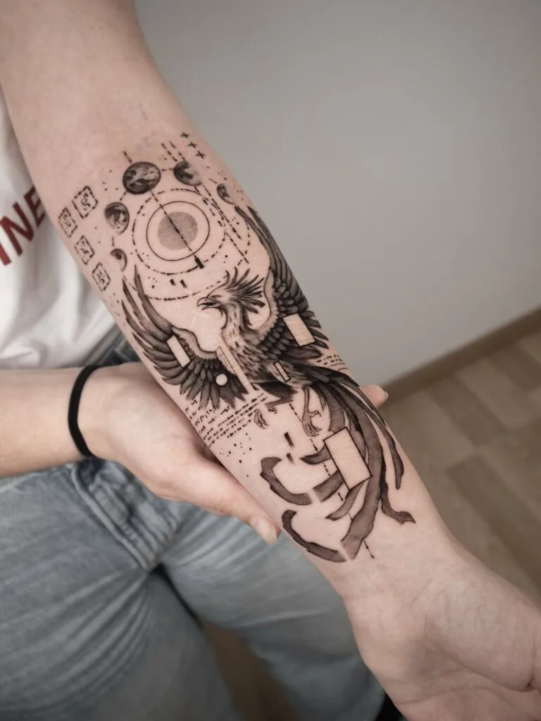 This forearm tattoo features a powerful phoenix rising, surrounded by an arc of moon phases and intricate geometric elements. The phoenix symbolizes rebirth, resilience, and the beauty of transformation through fire and challenge.