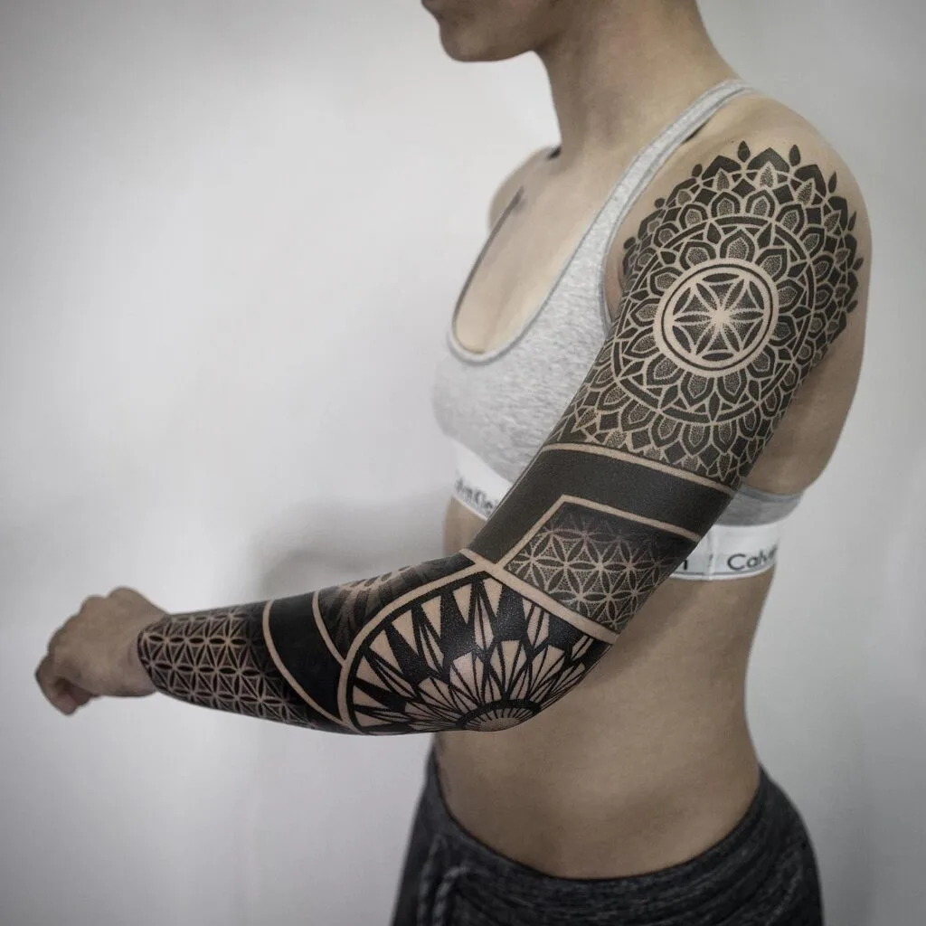 This full sleeve tattoo showcases the mesmerizing precision of sacred geometry. Intricate mandala patterns radiate from the shoulder, flowing seamlessly into geometric motifs like the Flower of Life and interlocking lines.
