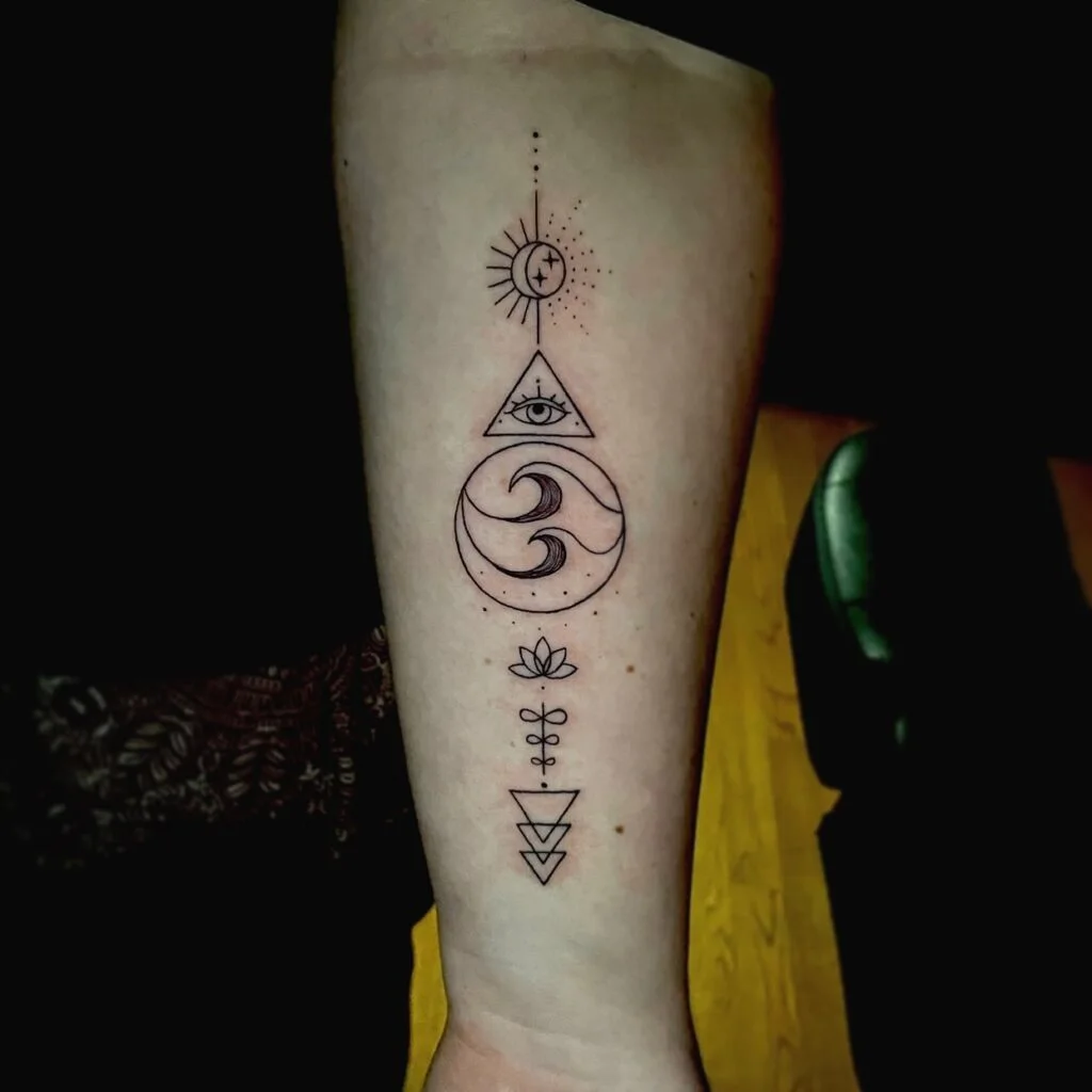 This mystical forearm tattoo blends sacred geometry with celestial symbolism to express balance, intuition, and universal energy. At the top, a radiant sun and crescent moon represent cosmic harmony. Below it, an all-seeing eye within a triangle signifies awareness and inner vision.