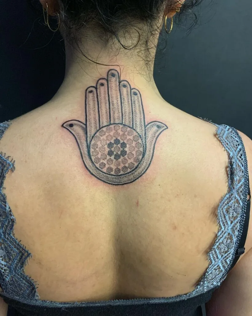 This spiritual tattoo features the Hamsa hand on the upper back, a powerful symbol of protection, blessing, and strength. At the center lies a detailed geometric mandala, combining hexagonal patterns that add depth and visual harmony.