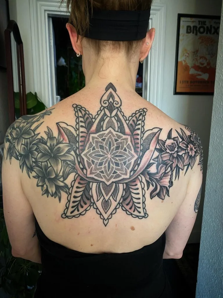 Sacred Mandala Lotus Back Tattoo with Floral Extensions