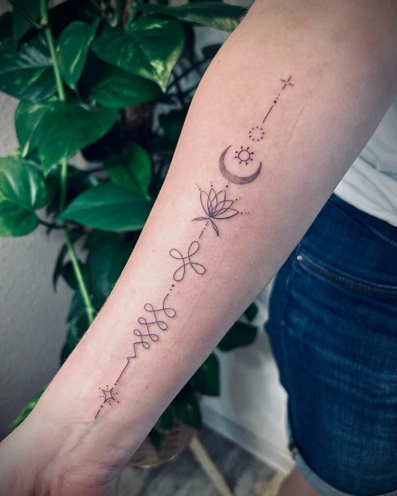 This graceful forearm tattoo flows with fine linework, blending spiritual and cosmic elements into a single, elegant path. Starting with a tiny starburst near the wrist, the design twists and loops like energy in motion—symbolizing life’s fluid journey.