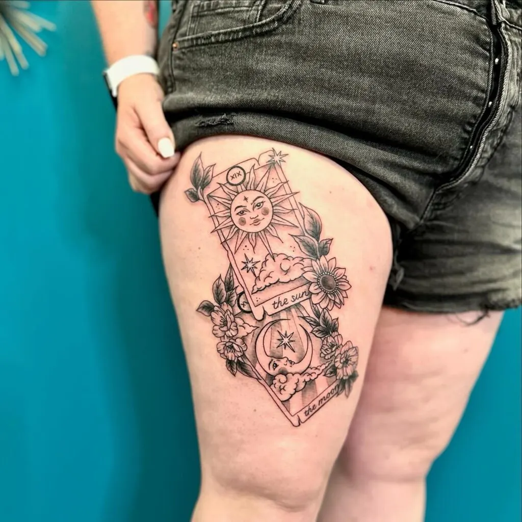 Sun and Moon Tarot Thigh Tattoo with Floral Accents