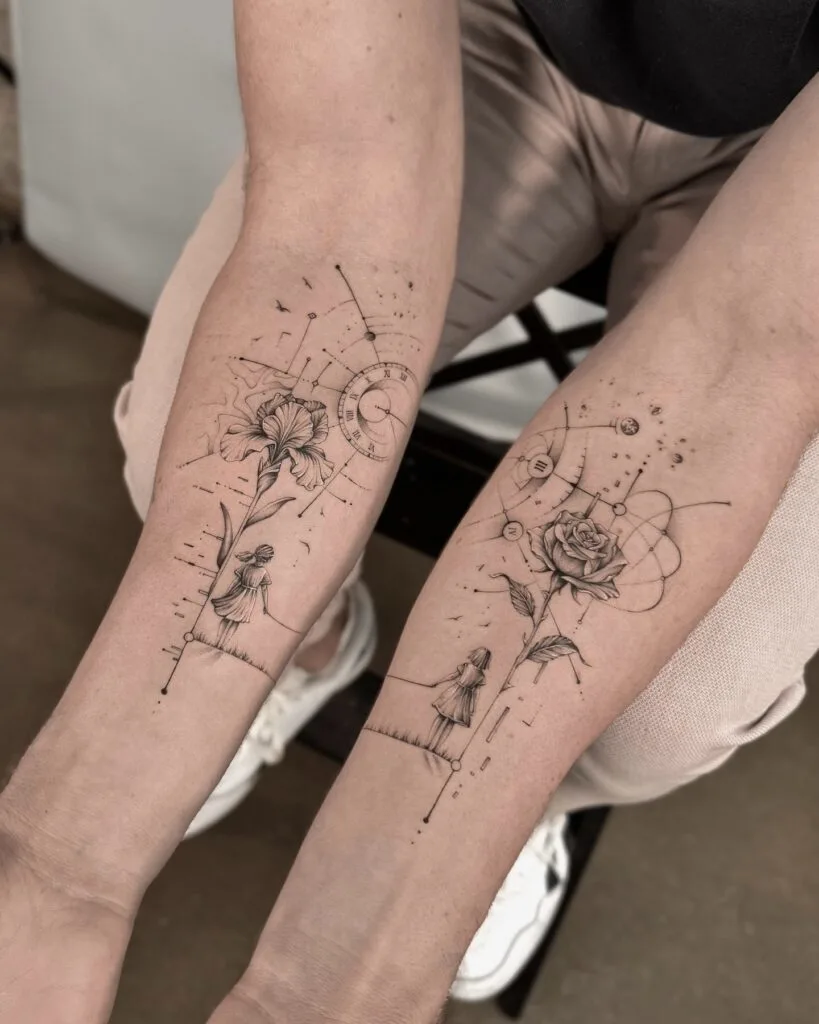 These stunning forearm tattoos mirror each other, portraying a delicate yet powerful narrative of growth and inner transformation. Each arm features a girl standing at the edge of a path, gazing upward—one toward a blooming iris, the other a rose—symbols of hope, resilience, and personal evolution.