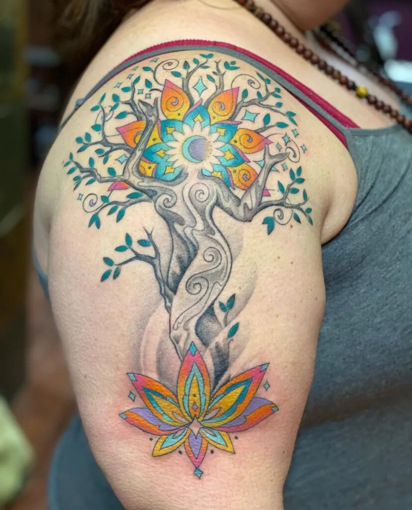 Vibrant Tree of Life and Lotus Tattoo