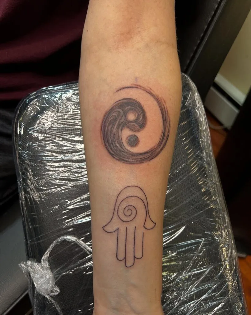 This forearm tattoo pairs two timeless spiritual symbols to express harmony and protection. At the top, a swirling Yin Yang design brings a dynamic twist to the classic emblem of balance between light and dark, masculine and feminine, action and stillness.