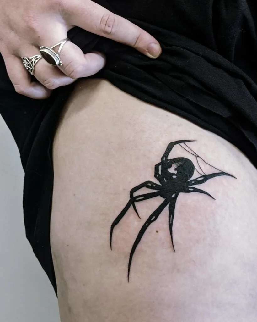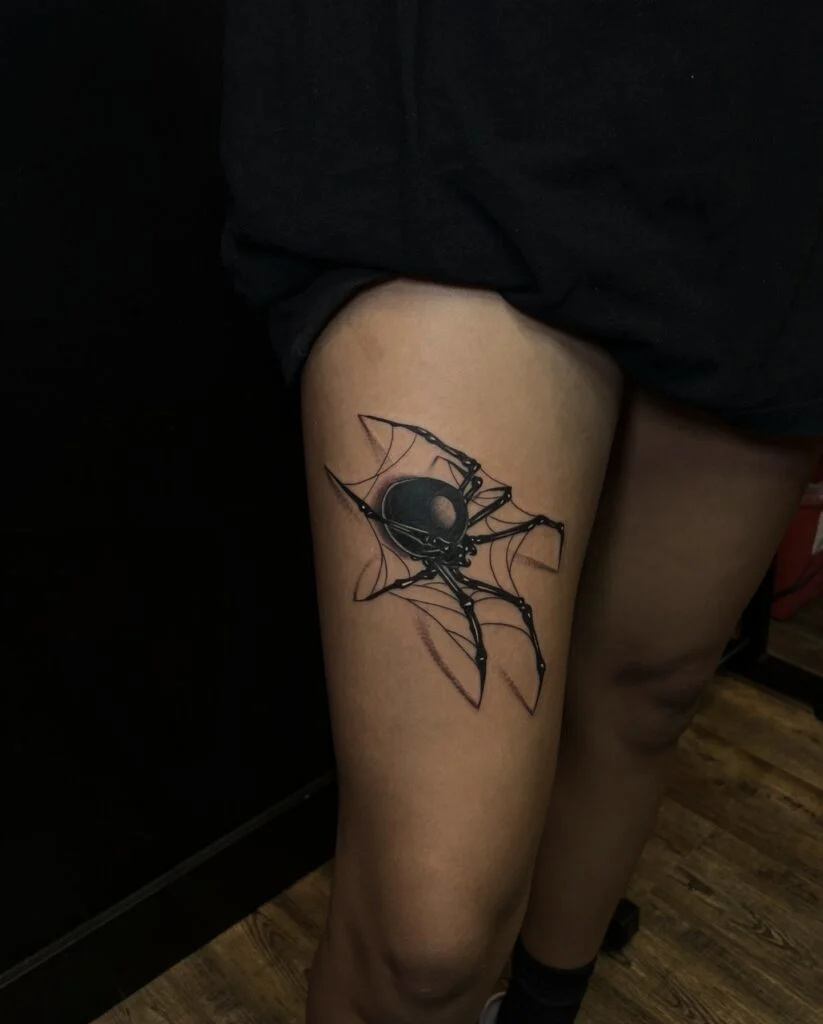 The silhouette-style design makes it bold and attention-grabbing, perfect for fans of gothic, horror, or creepy-crawly aesthetics. Placed on the thigh, this tattoo makes a confident statement and captures the eerie elegance of a spider in motion.
