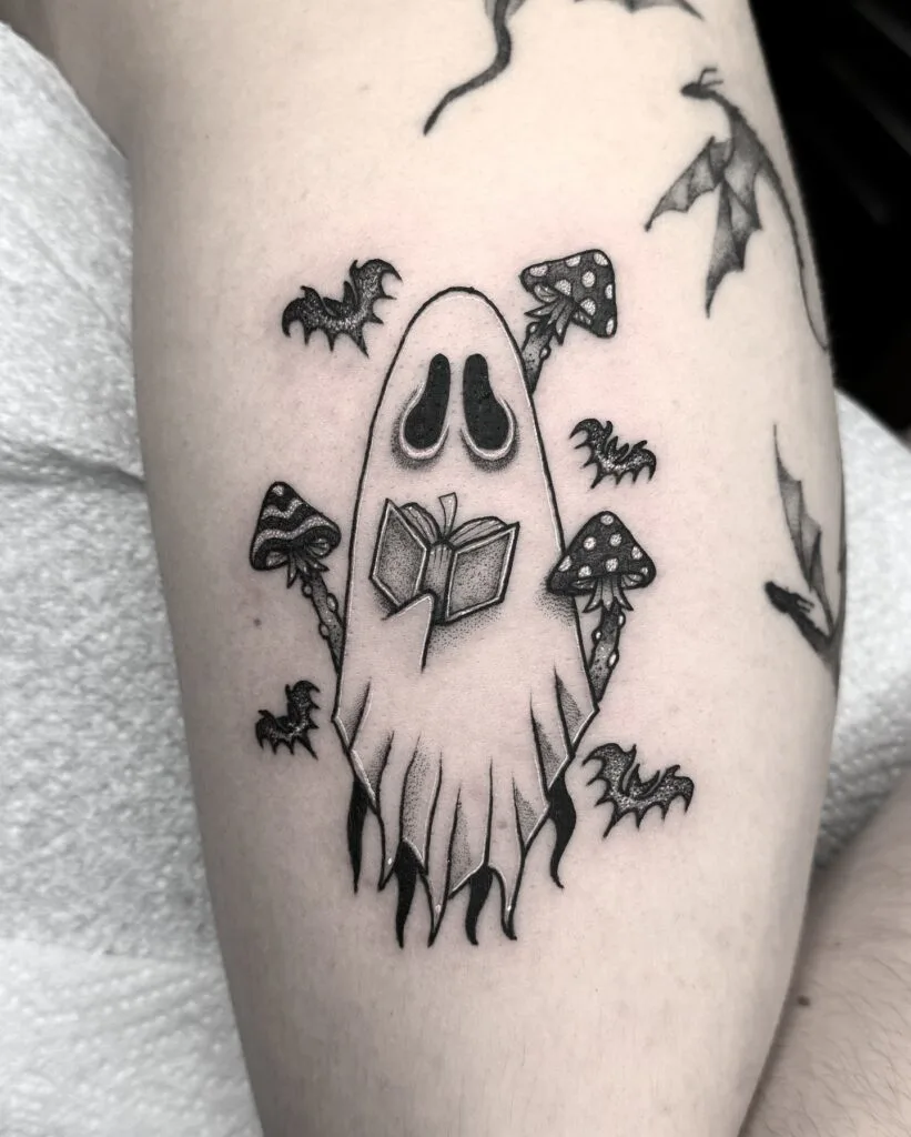 Book-Loving Ghost with Bats and Mushrooms Tattoo