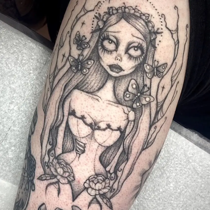 This beautifully shaded black and grey tattoo features a character inspired by Emily from Corpse Bride. With her hauntingly wide eyes, long flowing hair adorned with butterflies and a flower crown, she captures both sorrow and ethereal grace.