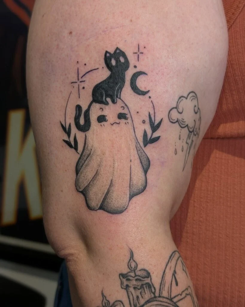 This adorable spooky tattoo features a blushing ghost draped in a soft sheet, with a curious black cat perched on its head. Surrounded by tiny sparkles, leafy branches, and a crescent moon, the scene feels magical and playful.