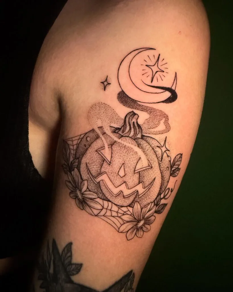 This beautifully detailed tattoo showcases a grinning jack-o’-lantern surrounded by flowers, leaves, and cobwebs, all illustrated in soft dotwork and clean linework. Above the pumpkin floats a dreamy crescent moon paired with sparkling stars and mist-like smoke, adding a magical, celestial vibe.