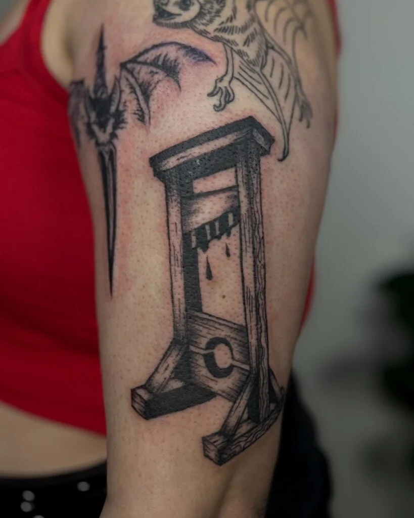 It’s a bold symbol of finality, rebellion, or dark history—evoking themes of mortality and revolution. Whether seen as gothic, political, or purely macabre, this design makes a dramatic statement for anyone drawn to the darker side of tattoo art.
