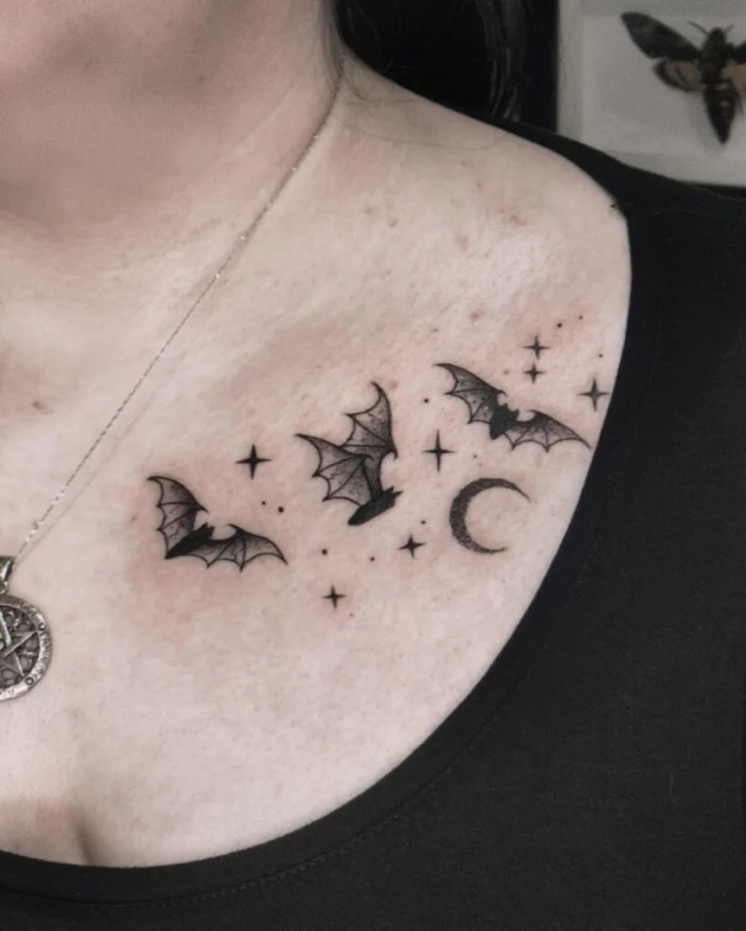 This delicate and spooky tattoo design features a group of bats fluttering across the collarbone, surrounded by tiny stars and a crescent moon. The bats are softly shaded with fine details in their wings, giving them a graceful, nighttime flight appearance.