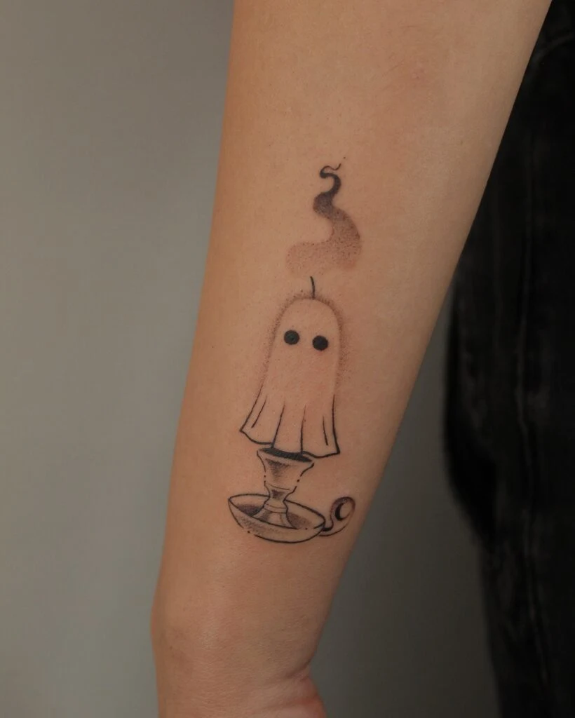 The design blurs the line between candle smoke and ghostly presence, making it feel both eerie and charming. Ideal for those who love subtle spooky themes with artistic flair, this tattoo offers a creative take on the idea of spirits lingering where candles burn out.