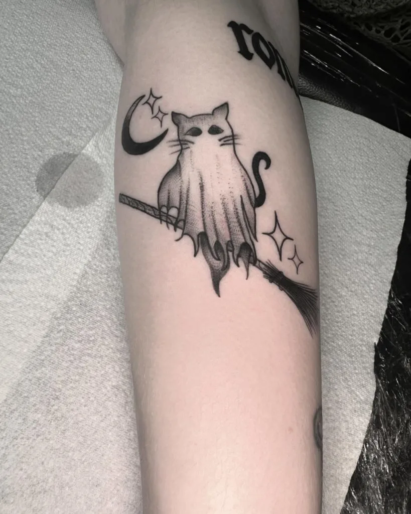 This playful black and grey tattoo features a cat dressed as a ghost, perched on a broomstick. With hollow eyes peeking through the sheet and pointy ears poking up, the design cleverly merges Halloween whimsy with feline charm.