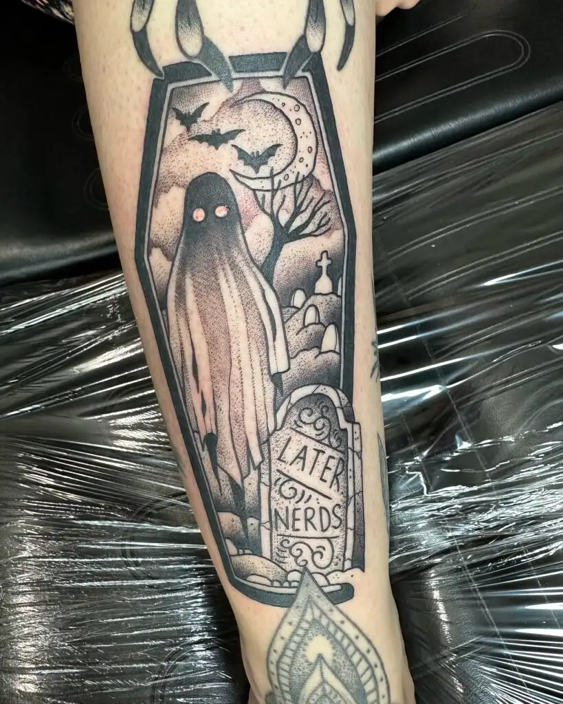 Ghost in Coffin with “Later Nerds” Tombstone Tattoo
