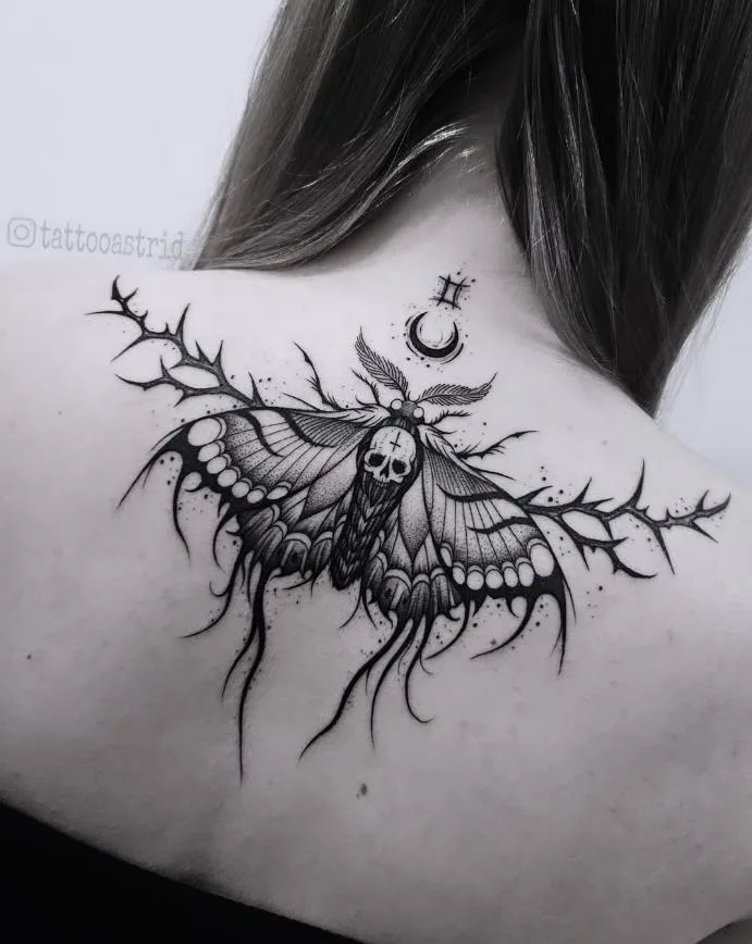 This striking upper back tattoo showcases a detailed death moth with a skull marking on its thorax, flanked by jagged, thorny branches extending from its wings. Above the moth, a crescent moon and astrological-style symbol enhance the mystical feel.