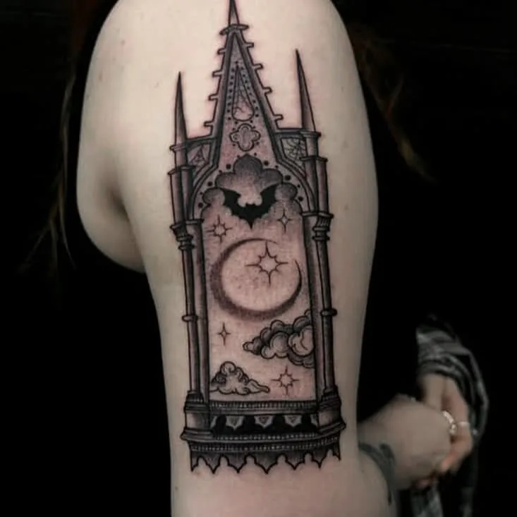 This tattoo beautifully frames a crescent moon, bat, and clouds within a tall gothic-style window. The architectural frame mimics a cathedral arch, with intricate linework and pointed spires adding a dramatic medieval flair.