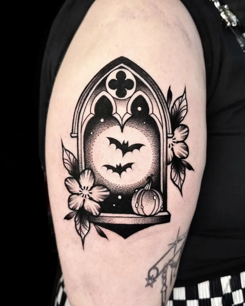 This bold blackwork tattoo features a gothic-style arched window framing a spooky nighttime scene. Two silhouetted bats fly across a glowing full moon, adding an air of mystery. At the base of the window sits a small pumpkin, nestled among beautifully shaded flowers and leaves.
