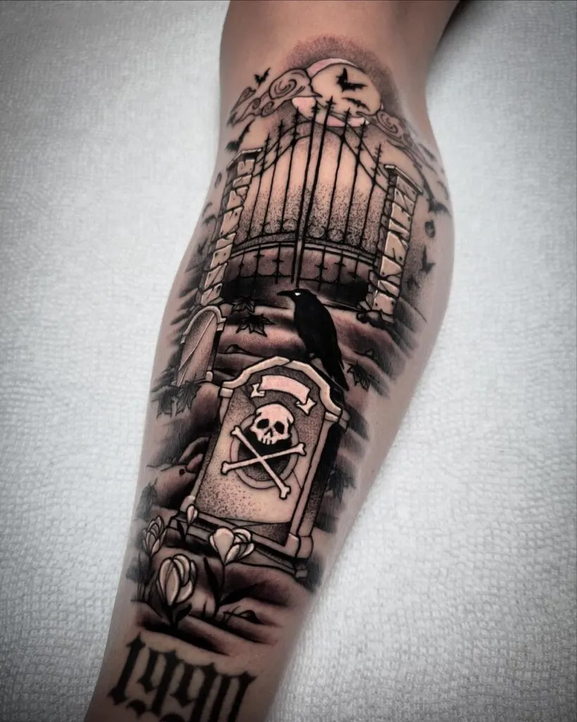 This hauntingly detailed tattoo depicts a graveyard at night, complete with a wrought iron gate, looming tombstones, and a full moon shrouded in swirling clouds. A skull-and-crossbones headstone stands at the forefront, watched over by a solitary black crow—adding a touch of ominous symbolism.