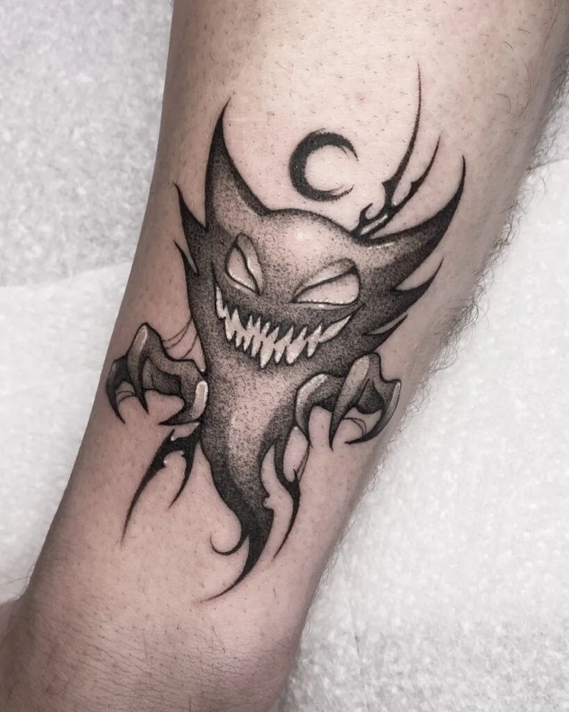 Styled with bold shading and sharp contrast, it closely resembles Haunter, the ghost-type Pokémon, while amplifying its horror aspects. This tattoo blends playful nostalgia with a darker, more menacing twist, making it a bold choice for fans of creepy characters, supernatural themes, and nightmarish designs with flair.