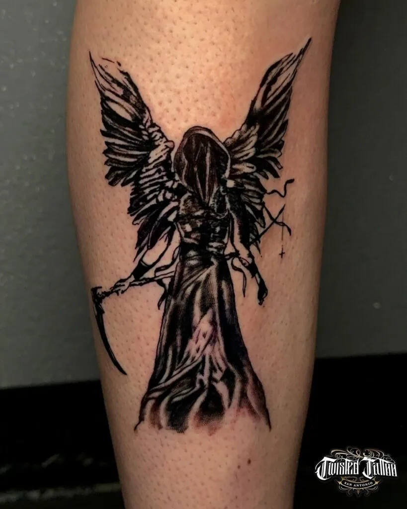 This powerful tattoo showcases a dark, hooded angel wielding a scythe, merging classic grim reaper imagery with divine, feathered wings. The contrast between the flowing cloak and detailed wings adds dramatic tension, while the figure’s faceless hood evokes mystery and fear.