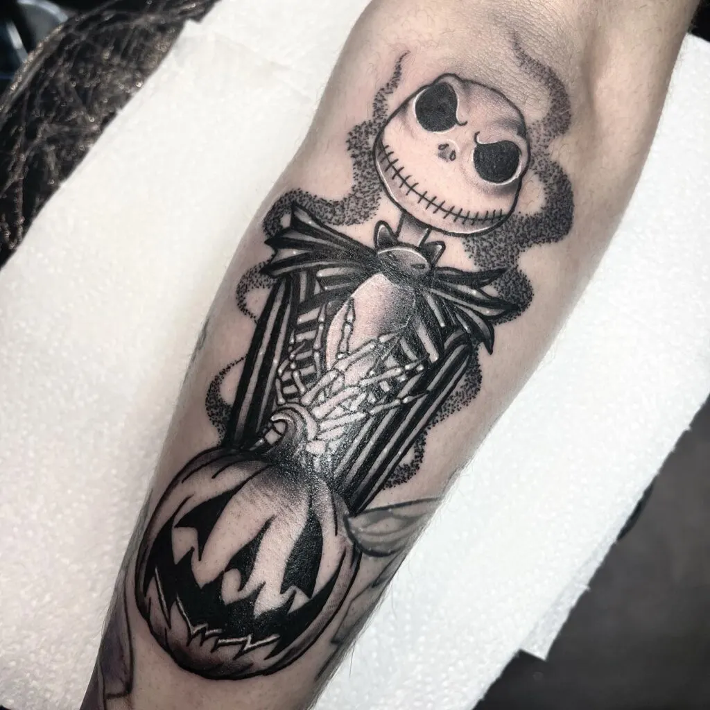 This bold black and grey tattoo captures the iconic Jack Skellington from The Nightmare Before Christmas in his signature striped suit. His skeletal grin and hollow eyes are surrounded by a smoky background that adds an eerie glow.