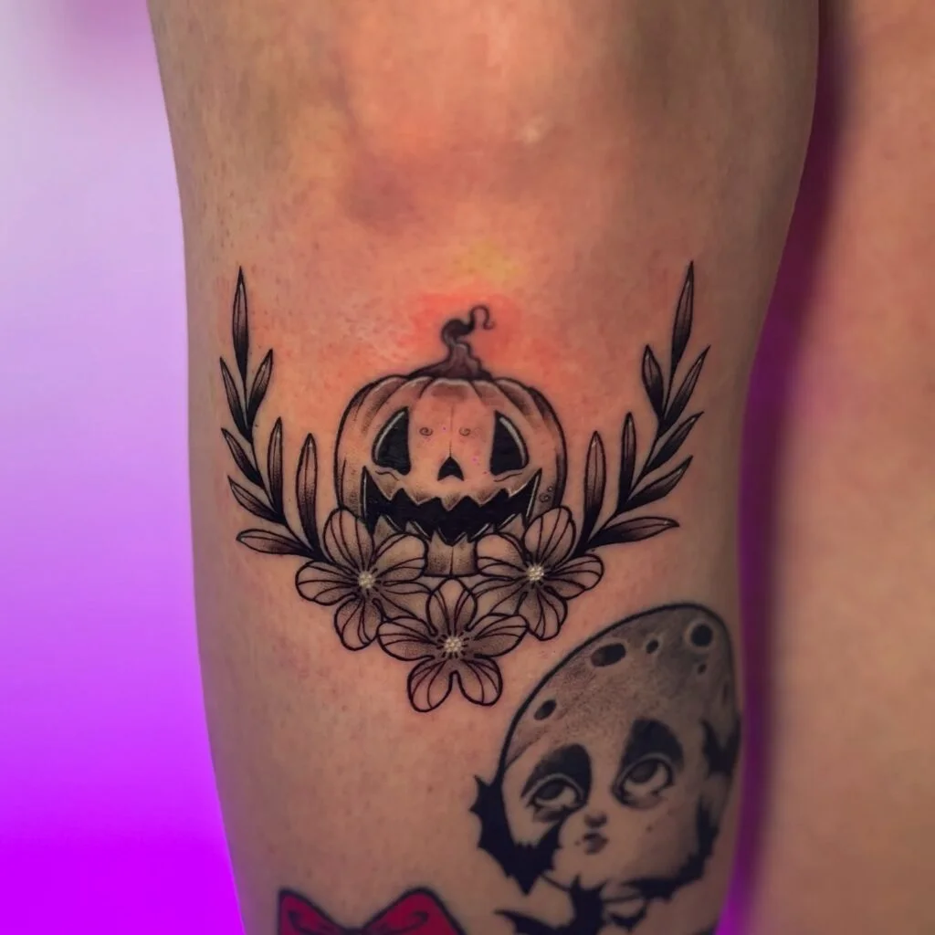 This stylish black and grey tattoo features a smiling jack-o’-lantern with bold, solid black eyes and a jagged grin. Framed by delicate flowers and autumn leaves, the pumpkin balances spooky and soft elements beautifully.