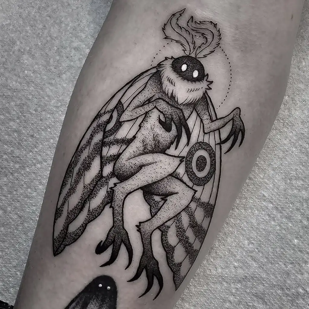 This eerie tattoo features a humanoid moth-like creature with glowing white eyes, shaggy fur, clawed limbs, and strikingly patterned wings. The design blends cryptid mythology with surreal fantasy, capturing a sense of lurking mystery and nocturnal power.